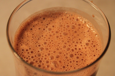 I decided I would go ahead and blog today’s diet update while I was still on top of my day. This is breakfast–a peanut butter cup smoothie made by a recipe found by way of Kalyn’s Kitchen. I don’t know who Kalyn is, but I love her kitchen.